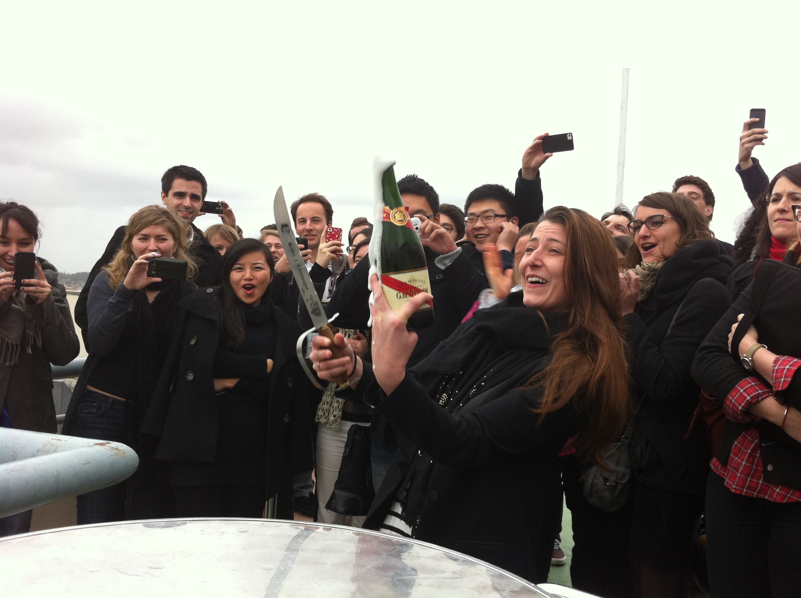 Trong hình là các bạn cùng lớp INSEEC Master 2 Wine của tôi đang tập mở chai Champagne của Mumm bằng thanh kiếm Champange (Champagne sword).