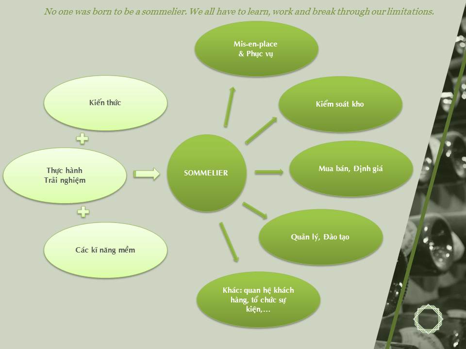 Ở Việt Nam, chưa có nhiều sommelier, đếm đúng là chỉ được trên 10 đầu ngón tay. Chúng tôi luôn cố gắng đào tạo chia sẻ để gây dựng thế hệ mới. Những chia sẻ về công việc trên đây có thể khiến các bạn trẻ cảm thấy công việc thật khó khăn và vất vả. Nhưng tất cả những công việc trên là cần thiết để có thể quản lý được công tác vận hành, phục vụ rượu vang trong nhà hàng.